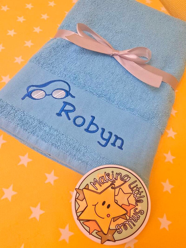 Make a splash with this vibrant, personalised swimming towel, featuring a bold goggle design that’s perfect for little swimmers. Whether you're hitting the pool, lounging at the beach, or gearing up for swim practice, this towel is designed to keep your little ones dry, stylish, and uniquely them.